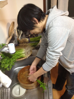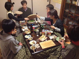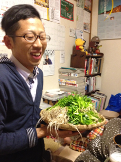 せんだいコミュニティカフェ準備室の忘年会です。芹は、名取の農家三浦くんの作つた芹。根つこまで食べられます。