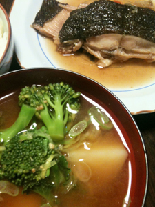 今日の晩ごはんは鰈の煮附けにしました。味噌汁はブロツコリと馬鈴薯です。