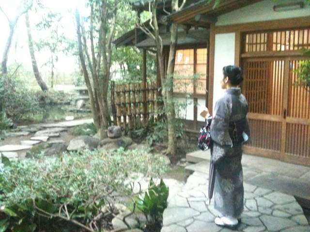 着物を着たら、早速バスに乗り美しい庭園の広がる緑水庵へ。