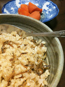 今日の夕飯はじやこ炒飯にしました。飯は玄米です。
